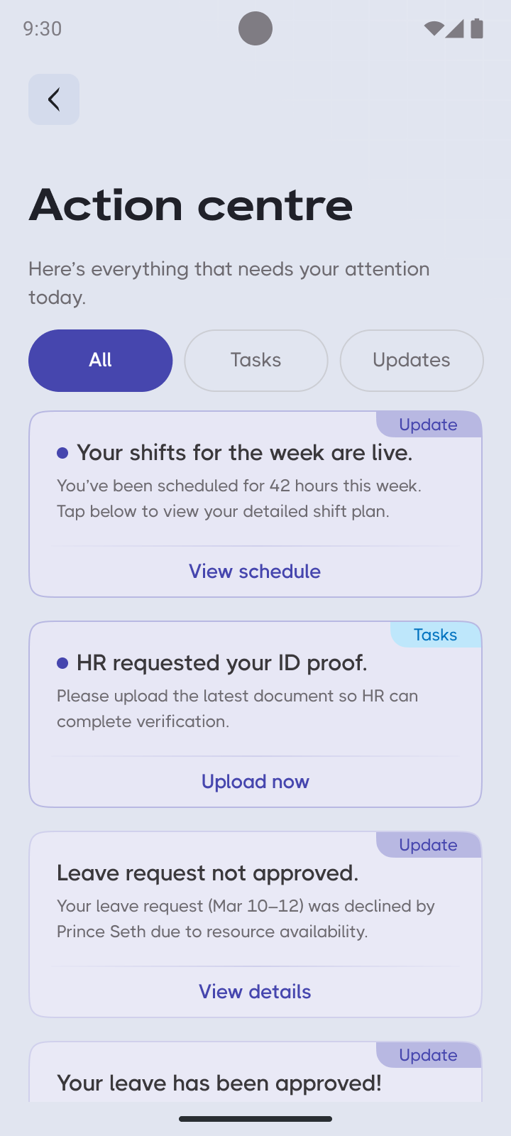 Everything employees and managers need right from their phone. No emails, no chasing, no delays.