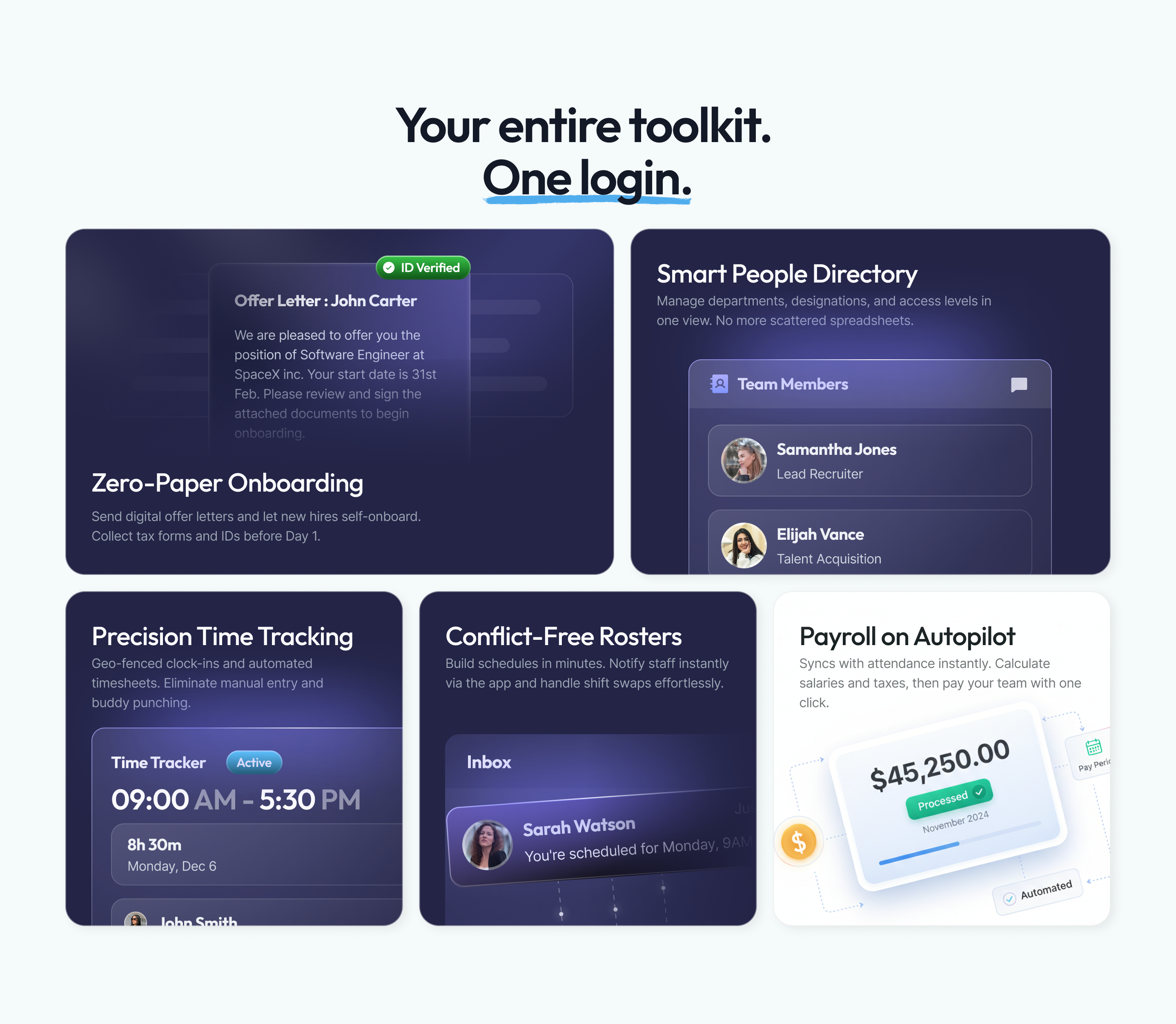Attendance, payroll, onboarding, and leave live in different places, causing messy back-and-forth.